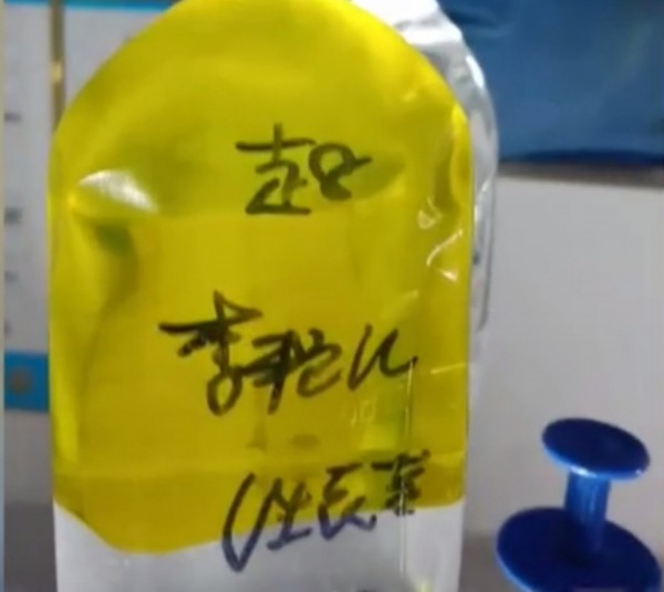 输液瓶上写的名字为“李艳某”。视频截图