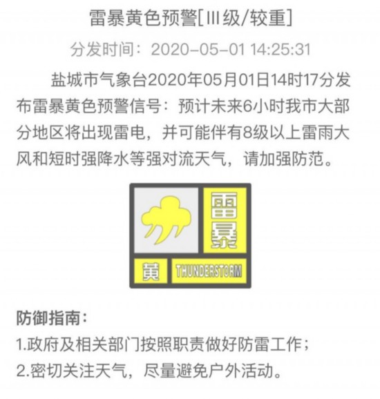 盐城市气象台2020年05月01日14时17分发布雷暴黄色预警信号:预计未来6小时我市大部分地区将出现雷电,并可能伴有8级以上雷雨大风和短时强降水等强对流天气,请加强防范。