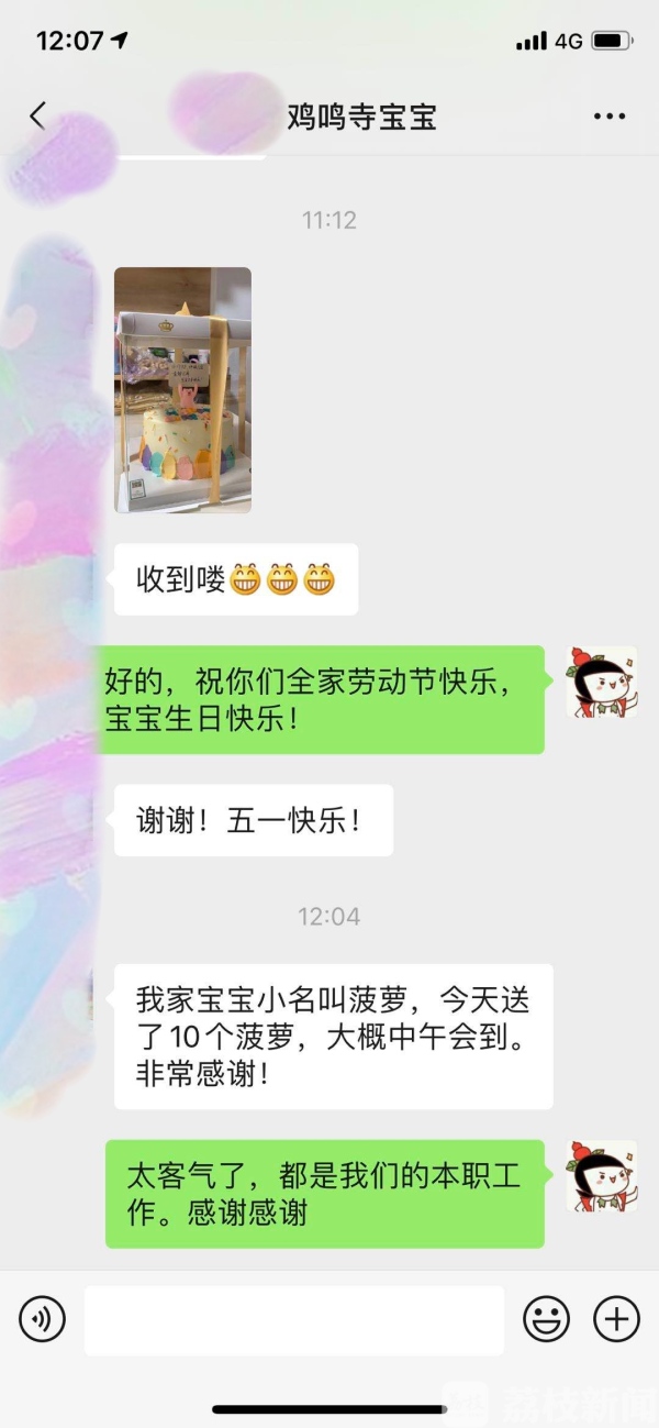 收到生日蛋糕的余女士非常开心,她表示因为她女儿的小名叫菠萝,于是她采购了十箱菠萝,在五一劳动节当天送到了鸡鸣寺站。她说:“小菠萝能在这么多可爱的叔叔阿姨的祝福中长大,真的非常幸运,感谢你们三年前的帮助。”