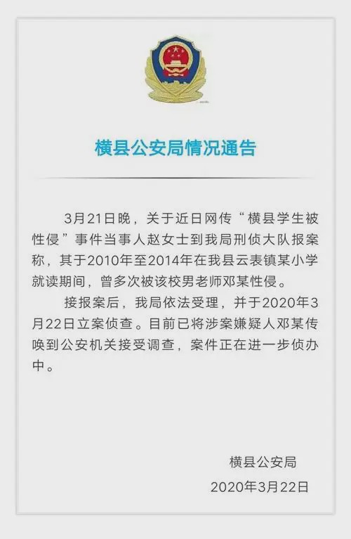 3月22日,横县公安局发布通告称,3月21日晚,当事人到该局刑侦大队报案称,其在云表镇某小学就读期间,曾多次被该校男老师邓某性侵。该局已将涉案嫌疑人邓某传唤到公安机关接受调查。