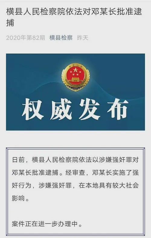 4月30日,横县检察院发布情况通告称,日前,该检察院依法以涉嫌强奸罪对邓某批准逮捕。经审查,邓某实施了强奸行为,涉嫌强奸罪,在本地具有较大社会影响。