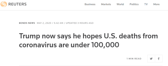 在上周一(4月27日)的白宫疫情简报会上,特朗普曾表示,美国可能有6万至7万人因感染新冠肺炎死亡。