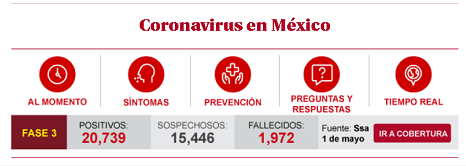 墨西哥卫生部宣布,截至当地时间5月1日晚7点,墨西哥全国确诊20739例新冠肺炎病例,较前一天新增了1515例。同时,墨西哥全国确诊死亡病例较前一天新增113例,总数已经上升到1972例。