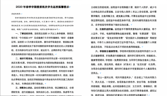 网上流传的西南大学返校复学通知的截图显示,校方实行的分批分期返校,是按照重庆市统一部署和要求,首先要求湖北籍学生全部返校。返校时间为4月27日,不能提前也不能延后,其他学生在未接到通知前不返校,违反规定会受到校规校纪处分。