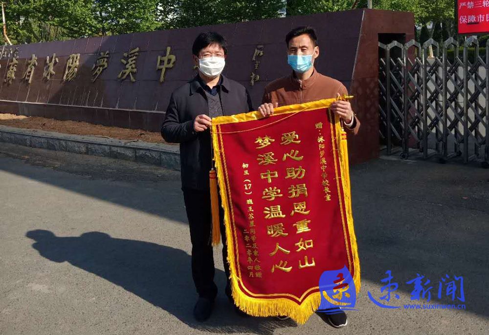 沭阳梦溪中学校长郇兆鹏(左)将善款交至王苏星的父亲王勇手中