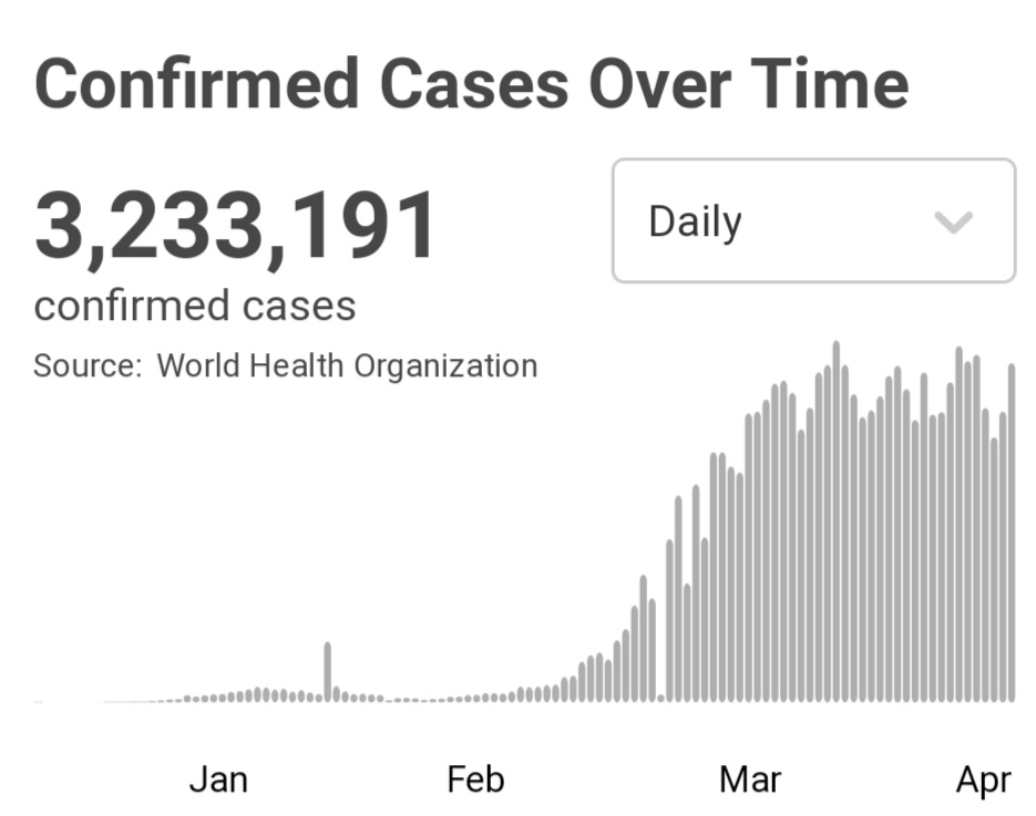 根据世卫组织最新实时统计数据,目前全球确诊新冠肺炎3233191例,死亡227489例,中国以外超过314万例。