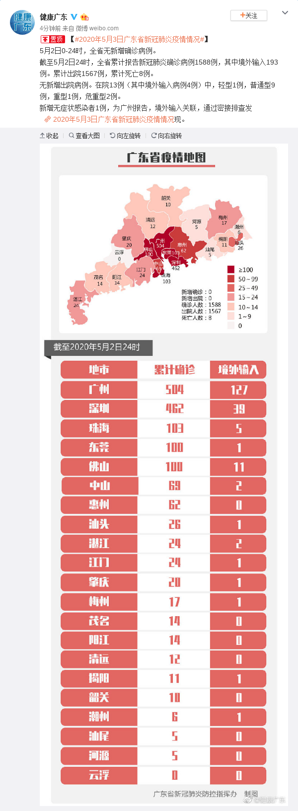 截至5月2日24时,全省累计报告新冠肺炎确诊病例1588例,其中境外输入193例。累计出院1567例,累计死亡8例。
