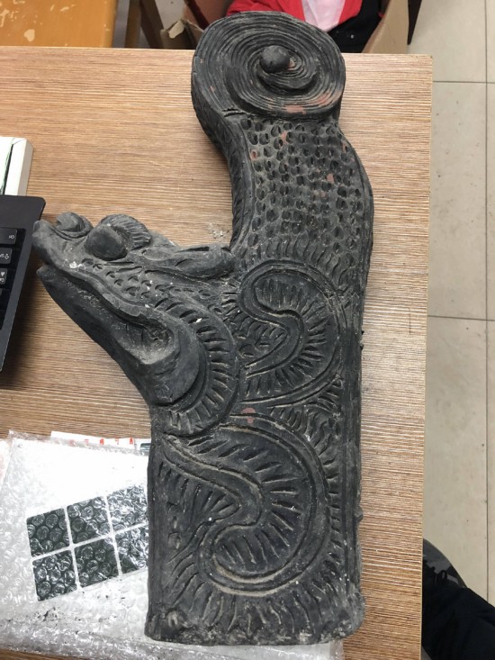 记者在社区看到,这个“鸱吻”的外观就像一条青龙仰望天空,浑身刻满“龙鳞”,蜷缩的尾巴顶部还刻有五个大字:“赵四房自造”。这个“鸱吻”由房主拆卸,赠予吴师傅,一直保存在他的家中,本次房屋修缮,吴师傅将其转赠予社区。
