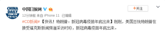 刚刚,美国总统特朗普在接受福克斯新闻频道采访时称,新冠病毒疫苗年底出来。