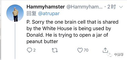 留言一:抱歉啊,特朗普正在使用白宫一个共享的大脑细胞,他正试图打开一罐花生酱(意思嘛,大家自己猜吧)。