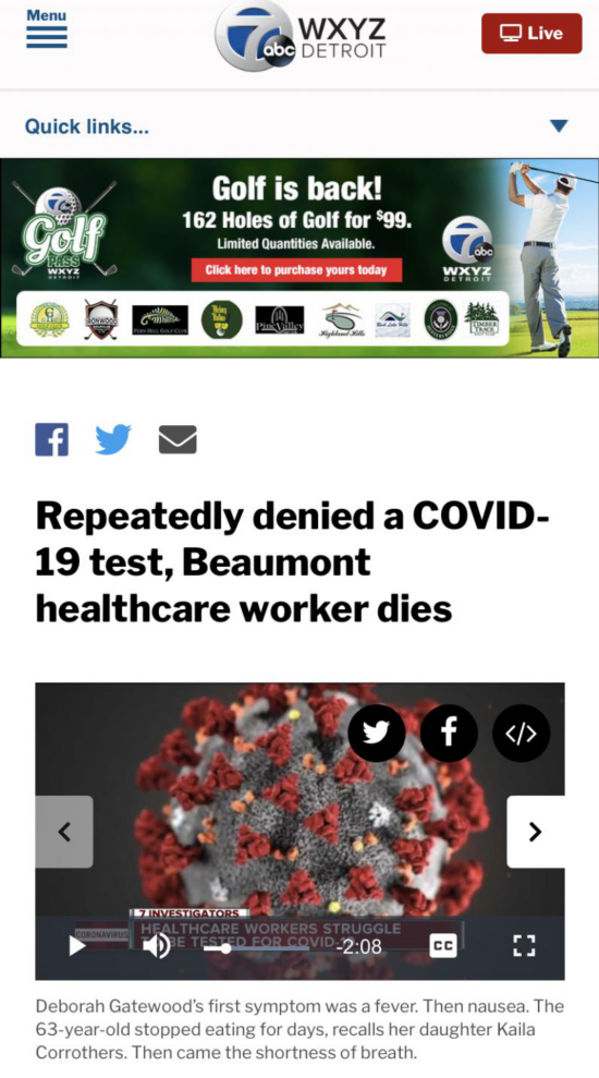 △ABC底特律报道,多次被拒绝COVID-19检测的医护人员,终致死亡
