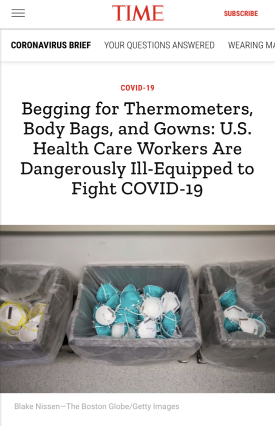 据《时代》杂志4月20日报道,该组织在3周之内收到了超过7000份申请,其中不乏一些美国大型医疗机构的医护人员。许多医护人员称他们已经没有剩余防护服可用了。“我们不得不把装尸袋往身上套来保护自己,”一名护士在申请表中写道,“我一个口罩戴了3周,其间接诊了数不过来的新冠患者。拜托,我们真的什么防护用品都不剩了。”