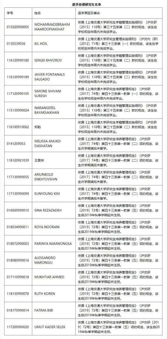 2018年,上海交通大学还专门就《关于研究生(AMIRKEYVAN GHAZVINIAN)退学处理决定》公告,以信件形式告知这位同学退学缘由,“因你自2017年春季学期起未注册。”同样,即使在去年,上海交大也对符合应予退学情形的MOHSEN HATAMI等12名研究生作了退学处理。