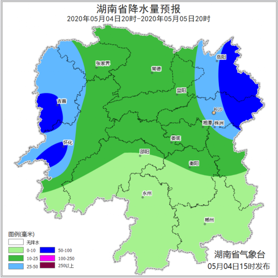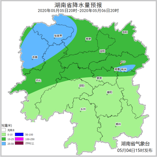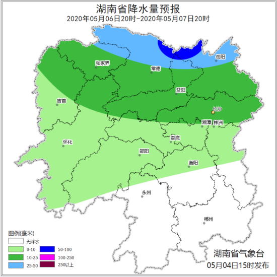 另据湖南省气象局预计,未来一周降雨北多南少,4至6日湘中及以北地区有一次较强降雨和强对流过程,其中湘西、湘北局地暴雨,并伴有短时强降水、雷暴大风、小冰雹等强对流天气;预计过程累积降雨量湘中及以北地区为50~100毫米,湘东北局地可达100~150毫米。7至9日省内自北向南还有一次降雨过程。