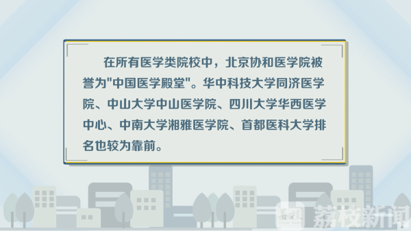 在所有医学类院校中,北京协和医学院被誉为"中国医学殿堂"。华中科技大学同济医学院、中山大学中山医学院、四川大学华西医学中心、中南大学湘雅医学院、首都医科大学排名也较为靠前。