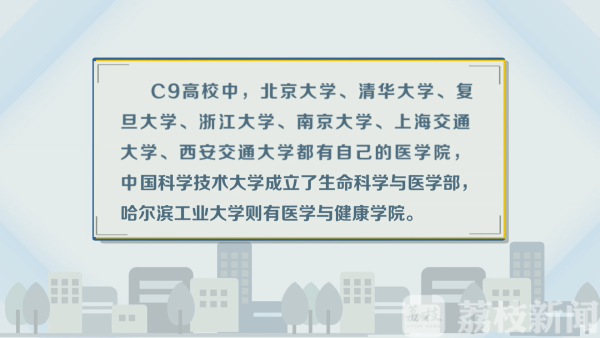 发展"新医科"是新时代党和国家对医学教育发展的最新要求,近年来,越来越多的高校纷纷成立医学院。C9高校中,北京大学、清华大学、复旦大学、浙江大学、南京大学、上海交通大学、西安交通大学都有自己的医学院,中国科学技术大学成立了生命科学与医学部,哈尔滨工业大学则有医学与健康学院。
