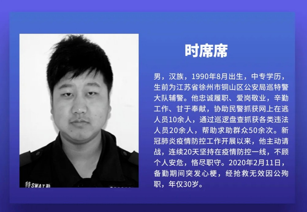 2月11日晚,时席席突发心梗,经抢救无效牺牲,年仅30岁。儿子离世后第4天,同为辅警的时卫东戴上儿子警帽,毅然返回到疫情防控一线,在他心中有一个坚定的信念:“儿子,你没站完的岗,没完成的工作,爸爸替你完成!”