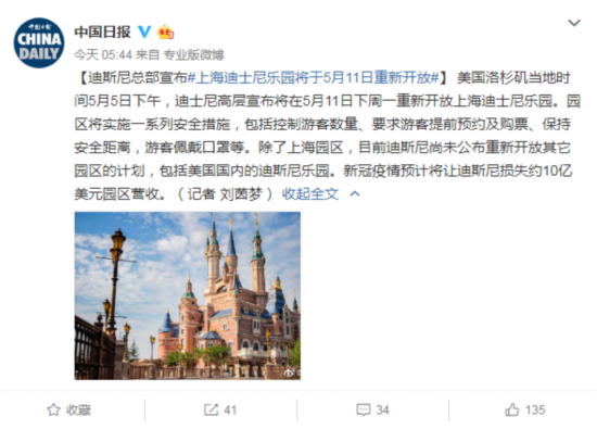 美国洛杉矶当地时间5月5日下午,迪士尼高层宣布将在5月11日下周一重新开放上海迪士尼乐园。园区将实施一系列安全措施,包括控制游客数量、要求游客提前预约及购票、保持安全距离,游客佩戴口罩等。除了上海园区,目前迪斯尼尚未公布重新开放其它园区的计划,包括美国国内的迪斯尼乐园。新冠疫情预计将让迪斯尼损失约10亿美元园区营收。(记者 刘茵梦)
