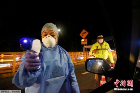 当地时间3月16日,哥伦比亚和厄瓜多尔之间的鲁米恰卡国际大桥上,一名厄瓜多尔卫生官员对车上的乘客进行体温测试。