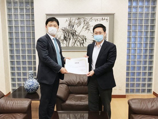 中国驻日本国大使馆教育处公使参事官胡志平(图左)向中国移动国际有限公司日本子公司首席代表浜田明颁发感谢状。(图片来源:中国移动)