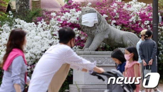 为宣传防疫知识,首尔一公园石狮子被戴上口罩。(news 1)