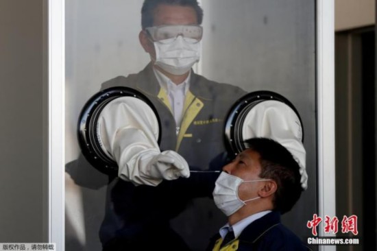 日本横须贺市,医务人员在一个箱状的临时检疫设施中模拟对人们进行核酸检测。