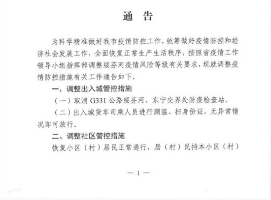 5月6日,绥芬河发布《绥芬河疫情防控指挥部第二十九号通告》,通告中对绥芬河出入城管控措施和社区管控措施进行调整: