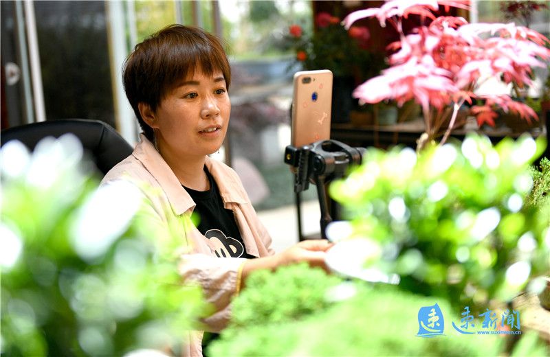 5月3日上午10点,在沭阳县扎下镇艺森园盆景旅游基地,胡晓翠正在直播间销售盆景。她在“五一”期间,每天6小时直播销售盆景,日收入过千元。