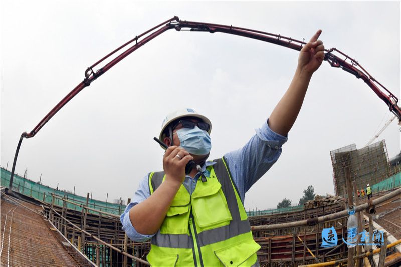 5月2日上午11点,在宿迁经济技术开发区厦门路学校建设工地,中建科工集团有限公司项目生产负责人鲍丙春在施工现场指挥。