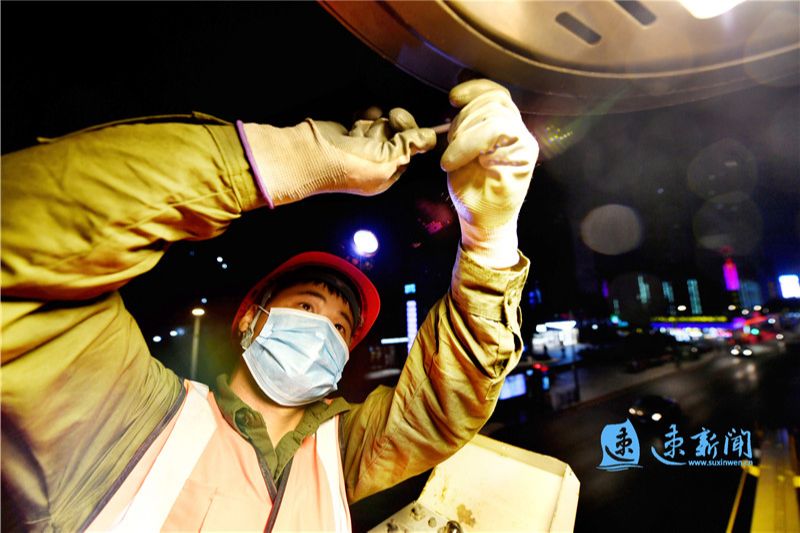 5月3日晚上8点20分,市百信照明工程有限公司维修工许昌凯正在幸福中路维修路灯。据了解,他们主要负责老城区6800多盏路灯的维护。