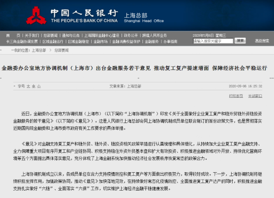 据央行上海总部5月6日消息,近日,金融委办公室地方协调机制(上海市)印发《关于全面做好企业复工复产和稳外贸稳外资稳投资金融服务的若干意见》。这是人民银行上海总部会同上海协调机制成员单位联合制订的首份政策文件,也是贯彻落实近期国务院金融委和上海市委市政府有关工作要求的具体举措。
