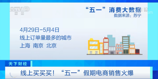 苏宁“五一”消费大数据显示,4月29日-5月4日上海、南京、北京为线上订单量最多的城市。大件家电销售喜人,空调销量环比增长482%,冰箱销量环比增长310%,洗衣机销量环比增长342%。