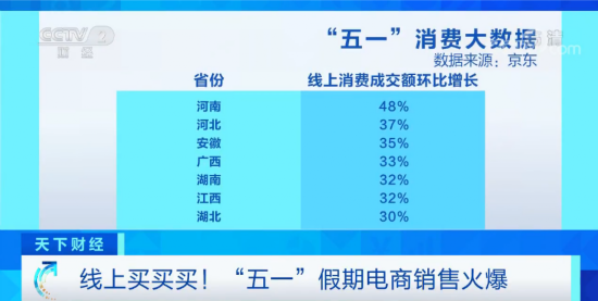京东数据显示,“五一”小长假期间线上消费热情高,北上广的线上消费趋于日常化。“五一”小长假对河南、河北、安徽等省份的线上消费拉动作用更强。
