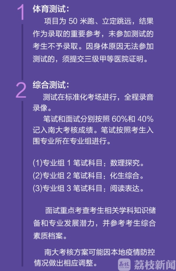 入围考生需参加体育测试和综合测试,测试时间为7月29-30日。体育测试项目为50米跑、立定跳远,结果作为录取的重要参考,未参加测试的考生不予录取。综合测试在标准化考场进行,全程录音录像。测试项目包括笔试和面试,分别按照60%和40%记入南大考核成绩。
