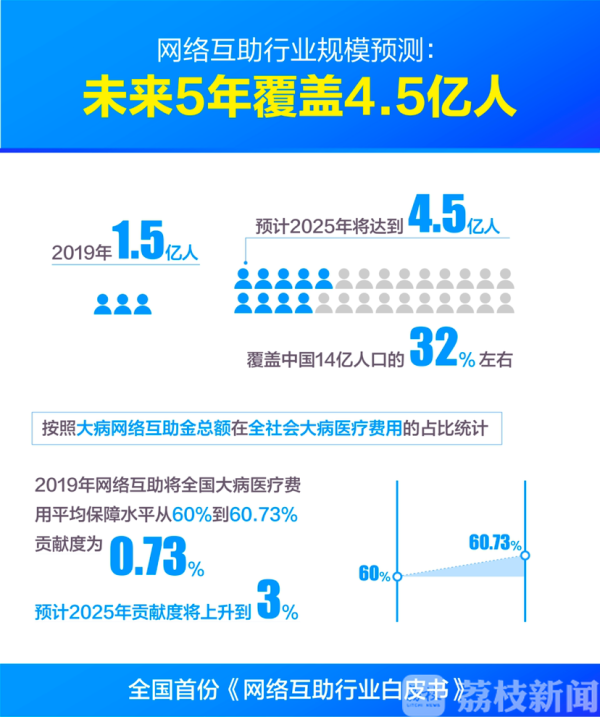 5月7日,蚂蚁集团研究院发布全国首份《网络互助行业白皮书》。白皮书发现,2019年我国网络互助平台的实际参与人数为1.5亿,预计2025年将达到4.5亿人,覆盖中国14亿人口的32%左右。按照大病网络互助金总额在全社会大病医疗费用的占比统计,2019年网络互助将全国大病医疗费用平均保障水平从60%提升到60.73%,贡献度为0.73%,预计2025年贡献度将上升到3%。