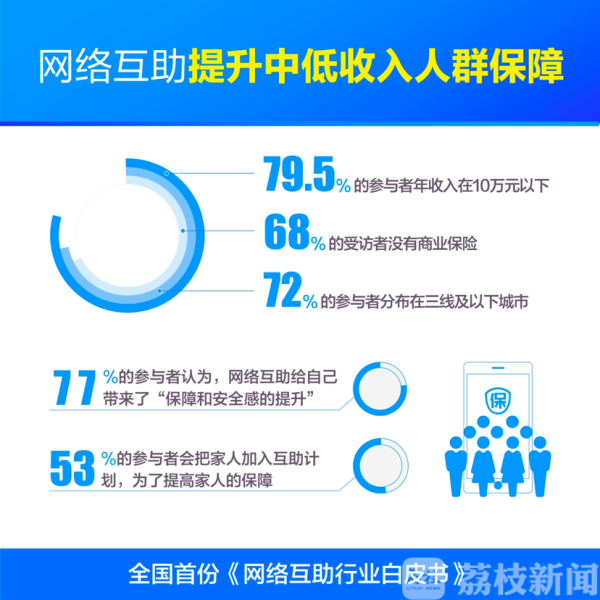网络互助的低门槛、高性价比,让中低收入人群在医保外增加了一层保障。白皮书的调研显示,79.5%的参与者年收入在10万元以下,68%的受访者没有商业保险,72%的参与者分布在三线及以下城市。