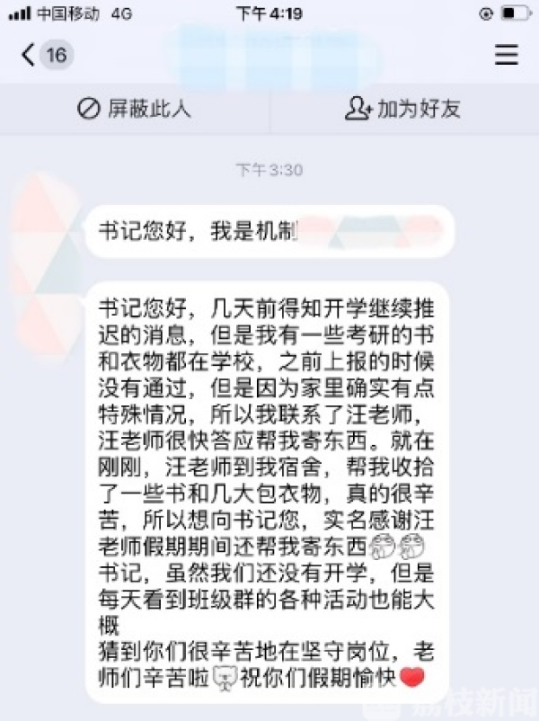 “老师,我的电脑还在宿舍,学习实在不方便,能不能帮我寄一下?”“老师,我在网上买的考研资料都寄到学校了,可以帮我转寄一下吗?”这些天,辅导员们接到了很多在线“订单”,辅导员们“照单全收”。