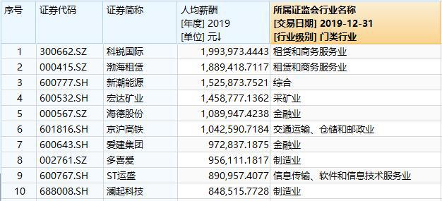 Wind数据显示,2019年科锐国际、渤海租赁、新潮能源、宏达矿业、海德股份、京沪高铁6家上市公司人均薪酬(=应付职工薪酬(本期增加值)/员工人数)超百万!