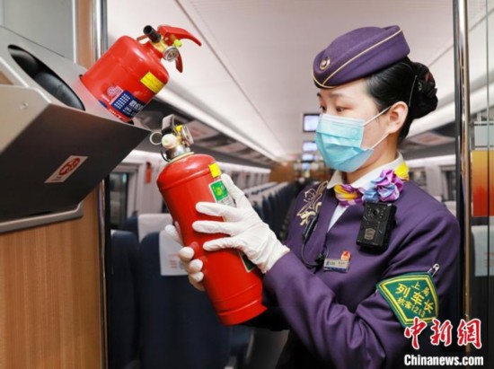 G36次列车长在列车始发前检查车厢内的消防安全设施。 周围 摄