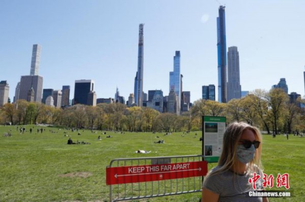 当地时间4月28日,新冠肺炎疫情下的纽约中央公园草坪树立警示牌,提醒人们保持社交距离。据美国约翰斯·霍普金斯大学发布统计数据,截至28日傍晚,美国累计新冠肺炎确诊病例已经超过101万例。 中新社记者 廖攀 摄