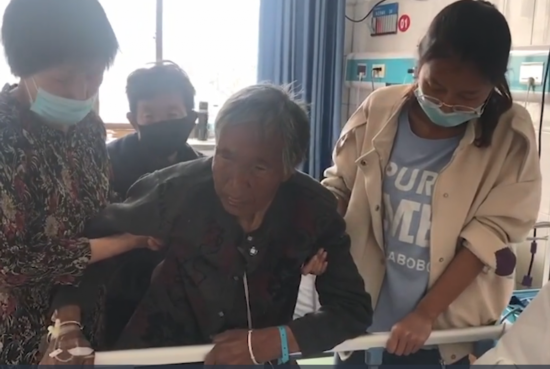 5月7日,澎湃新闻记者在陕西榆林靖边县中医医院内看到,此前媒体报道的“被活埋母亲”,在家人搀扶下,正在做康复训练。家人称老人并未瘫痪,只是因年龄大了腿脚不便。