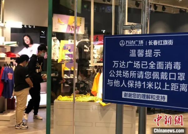 疫情期间,某商场提示顾客佩戴口罩,并与他人保持1米以上距离。郭佳 摄