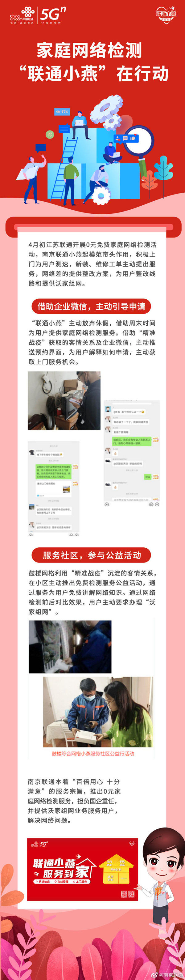 家庭网络检测,“联通小燕”在行动。南京联通小燕在小区主动推出免费检测服务公益活动,为用户检测网络及讲解网络知识。联通小燕, 服务到家。