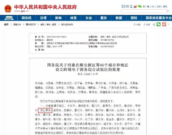 5月6日,中国政府网发布了《国务院关于同意在雄安新区等46个城市和地区设立跨境电子商务综合试验区的批复》。此次获批的46个城市中包括连云港市。