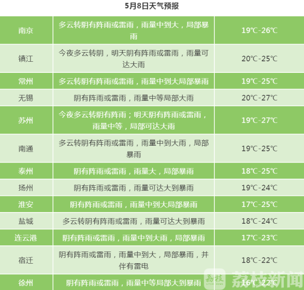 5月10日全省阴转多云到晴;5月10日最低温度:沿江和苏南地区17~18℃,其它地区14~15℃;5月10日最高温度:全省25~26℃。