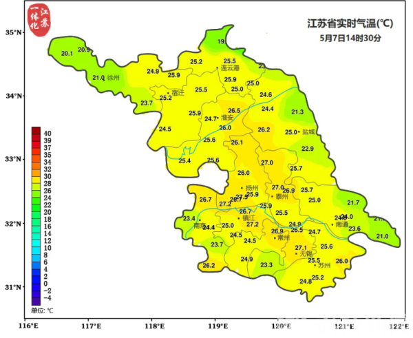 今天白天江苏省云量较多阳光难觅。据江苏省气象台消息,14时30分全省大部分地区的气温在24-26℃,最高扬州27.5℃。东部沿海以及徐州西北角略低些,刚刚超过20℃。