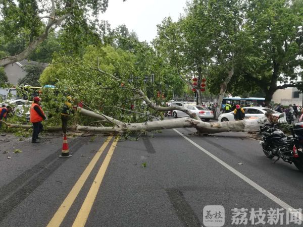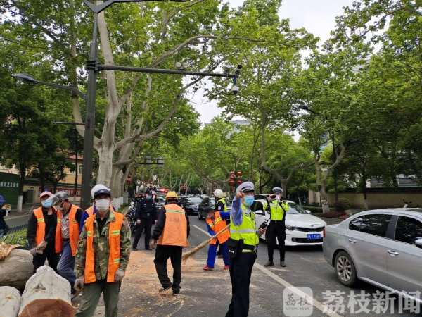 正在附近巡逻的南京交警一大队民警立即到场疏导交通,由于断倒的大树较大,大队立即启动应对预案,秉着就近原则,迅速调配路面警力,安排一部分执勤人员于大树倒下的地点疏导滞留车辆,另一部分警力则于事发现场向前后路口延伸,在北京东路龙蟠中路路口、北京东路兰园路口实施车辆分流,并且与园林部门联系,等待专人来处理已倒树木。