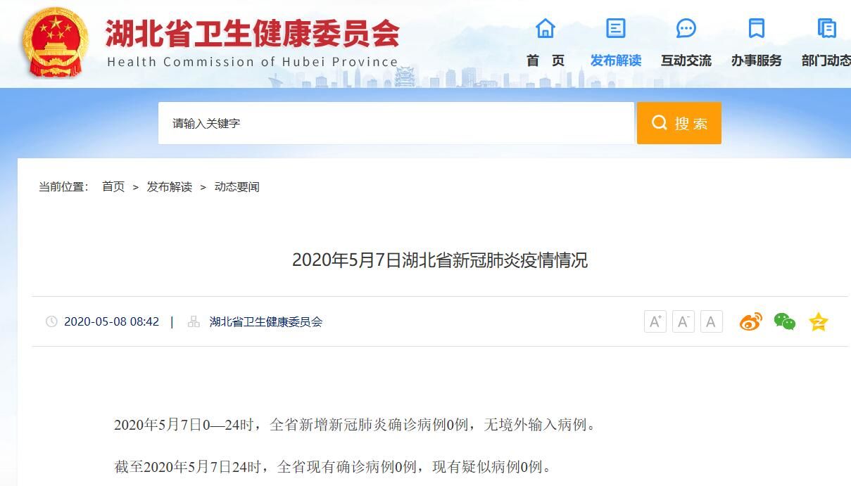 荔枝新闻讯 据湖北省卫健委消息,2020年5月7日0—24时,全省新增新冠肺炎确诊病例0例,无境外输入病例。
