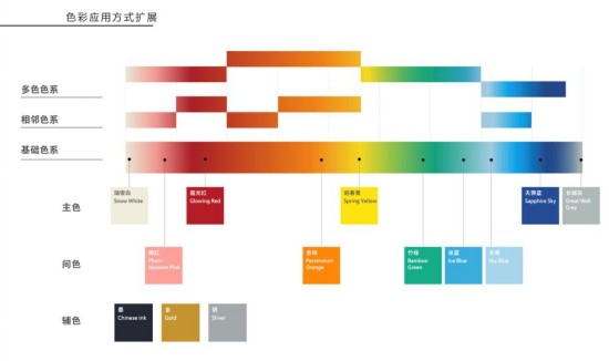色彩系统包括主色、间色、辅助色三部分。主色包括霞光红、迎春黄、天霁蓝、长城灰、瑞雪白: