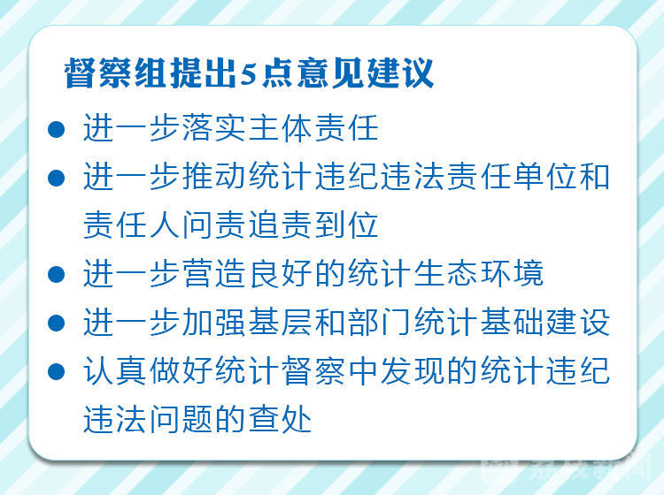督察组向江苏省委、省政府提出5点意见建议,一是要进一步落实主体责任,深入学习习近平总书记重要讲话指示批示精神,坚决贯彻落实党中央、国务院关于统计改革发展决策部署;二是要更加自觉担负起组织领导本地区防范和惩治统计造假、弄虚作假的政治责任,进一步推动统计违纪违法责任单位和责任人问责追责到位;三是要进一步营造良好的统计生态环境,保障统计机构和统计人员依法独立行使统计职权;四是要进一步加强基层和部门统计基础建设;五是要认真做好统计督察中发现的统计违纪违法问题的查处。有关整改情况应在3个月内向国家统计局反馈,并按照有关规定向社会公开。